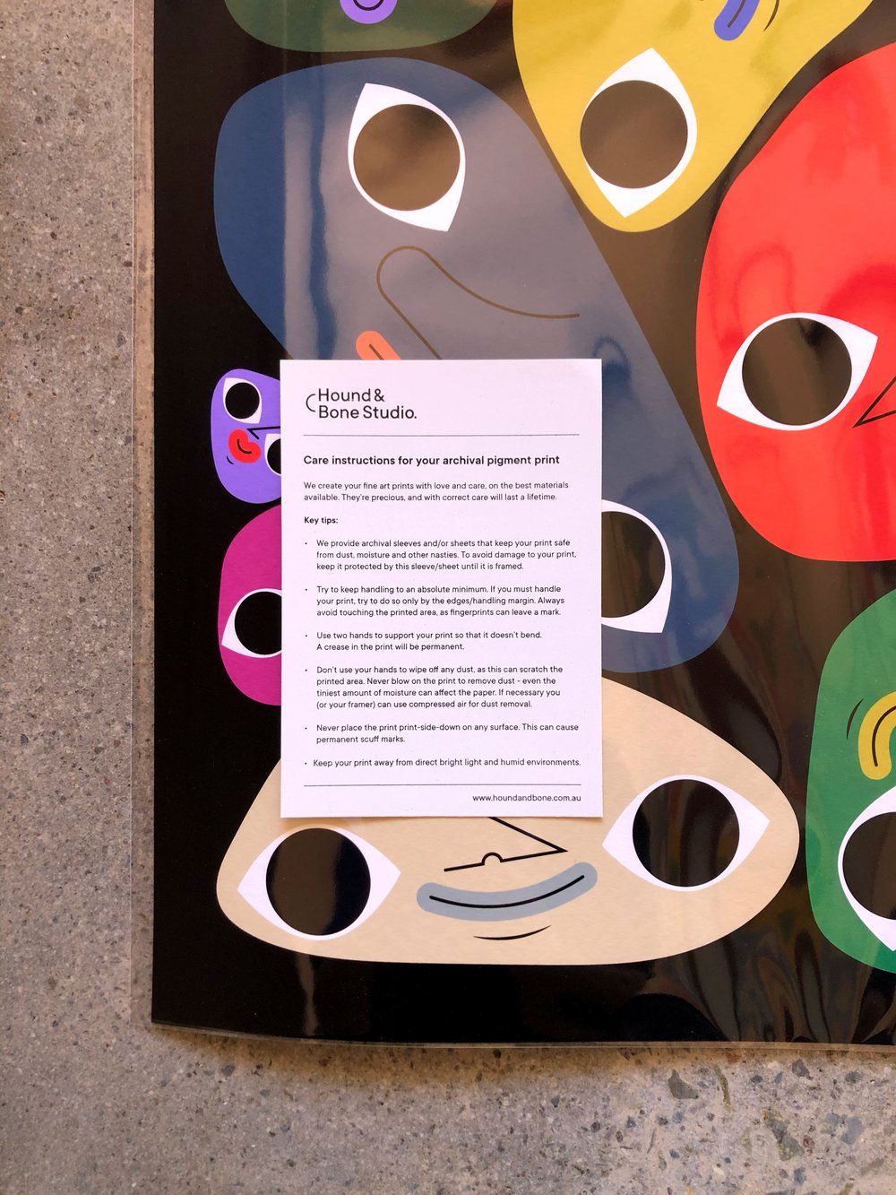 Every print comes with a protective archival sleeve and a print care slip courtesy of my wonderful Melbourne based printers: Hound and Bone Studio.